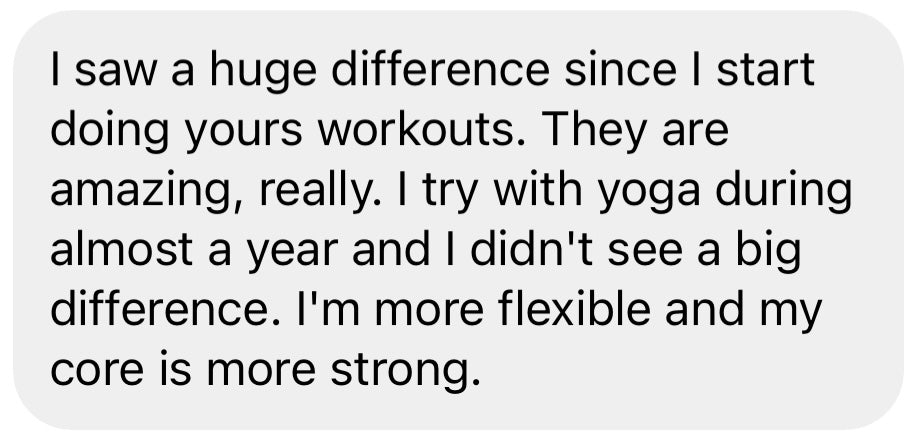 I love following the weekly schedule but at the same time to be able to modify it if needed. It’s very efficient, i can feel it in all my muscles each day and the breathing part is stunning, so efficient !!! I also like how Marina describes each exercice, i feel as if i had a coach at home.